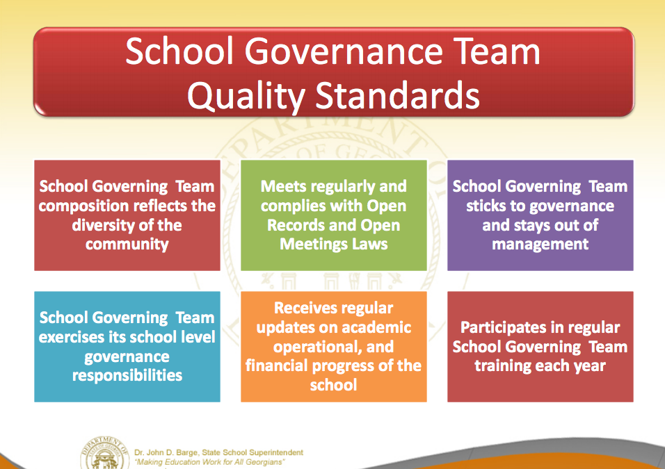 Appointed Local School Governance Teams, chaired by the school principal and consisting of various school community members such as teachers, parents, community members, business leaders and law enforcement, will be able to focus the educational offerings of schools while still meeting state standards, according to Blackmon.
