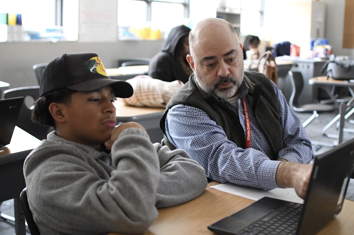 Special education department teacher and Multi-Classroom Leader (MCL) Brad Williford works with a student in Room 134 on Nov. 28, 2023. Williford is one of two MCLs introduced to Clarke Central High School at the beginning of the 2024-25 school year to provide support to freshmen. “We want to be in the classroom, we want to have conversations with teachers, and then we also have to spend time researching, pulling data, having conversations, going to trainings, all these different things,” Williford said. Photo by Aza Khan