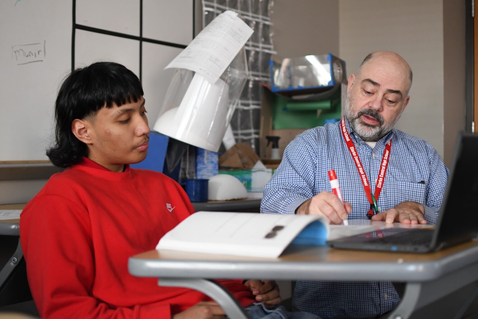 Clarke Central High School Multi-Classroom Leader and 2023-24 Teacher of the Year, Brad Williford, works with one student in Geometry in Room 134 on Nov. 28, 2023. The Teacher of the Year selection process was changed this year to welcome nominations from those outside of Clarke County School District faculty. “I like the idea that communities, students and families can nominate teachers,” Teacher of the Year Building Selection Committee Chair Dr. Summer Smith said. “(Students) are the consumers of the teaching and the learning that goes on (at CCHS), and (they) have a direct view of good quality teaching in classrooms.” Photo by Aza Khan