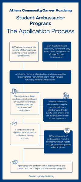 An infographic displays the application and appointment process of the Athens Community Career Academy Student Ambassador Program. The program’s recruitment team has looked for applicants’ commitment to the ambassadors’ responsibilities and values. “(Being a student ambassador is) a great thing to put on a resume, but if you’re not passionate about it, if you don’t care, if it’s just something that you feel obligated to, I wouldn’t (apply),” ACCA Student Ambassador Mariah Carson, a Clarke Central High School senior, said. “Make sure you care about it, because if you (don’t), it’ll show in your interview.” Graphic by Emlyn McKinney