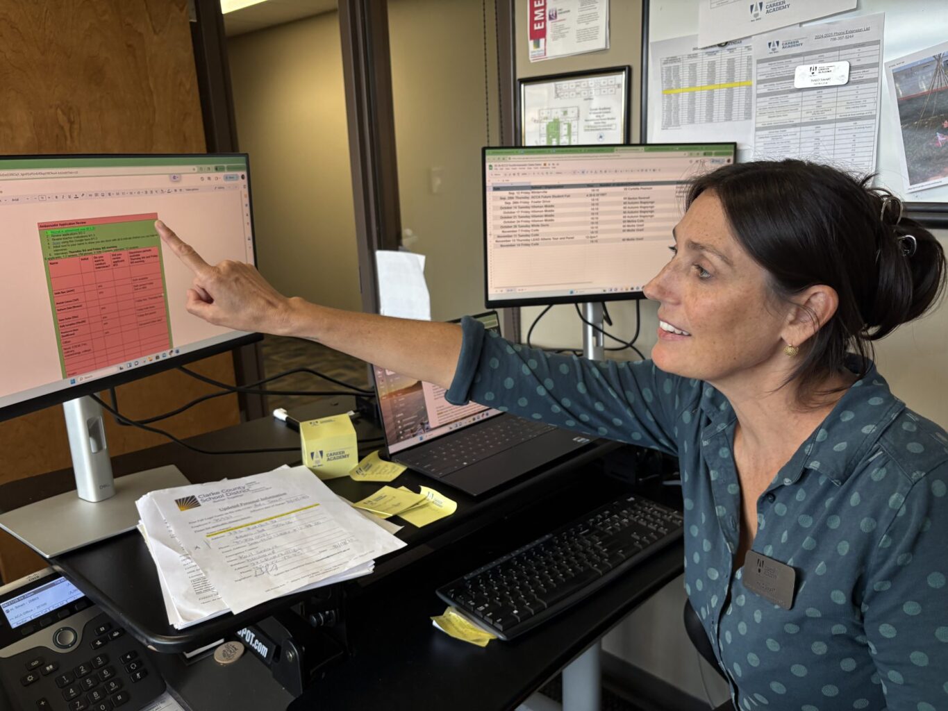 Athens Community Career Academy Workforce Development Coordinator Halo Smart points to her Ambassador Application Review document in Room 37 at ACCA on Aug. 21. Smart oversees the ACCA Student Ambassador Program and found it an important way to advocate for the ACCA. “(The ACCA) really (has) to explain ourselves, whereas Clarke Central (High School) never has to explain what they are,” Smart said. “Part of our (Ambassador) Program is explaining ourselves to students in the community. Why should you come here for part of your day? What is it that’s going to happen here?” Photo by Emlyn McKinney