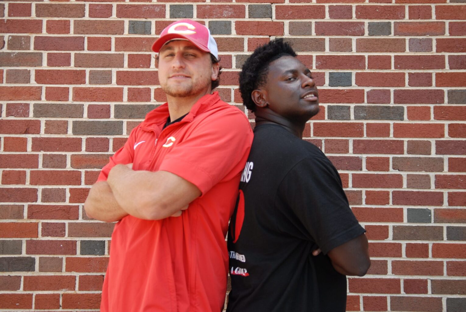 Host Dream Freeman, an ODYSSEY Media Group Sports Staffer and varsity Clarke Central High School defensive end, poses with CCHS varsity running back football coach Jack Mangel on Sept. 5 in the CCHS Media Center Courtyard. Mangel took time out of his day to recap the CCHS football team’s loss on Aug. 29 against Jefferson High School with a score of 42-10 and preview the Gladiators upcoming game against North Oconee High school on Sept. 5. “A thorn (during the game against JHS) is probably our inexperience, which will only get better as the season goes on,” Mangel said. Photo by Miriam Silk