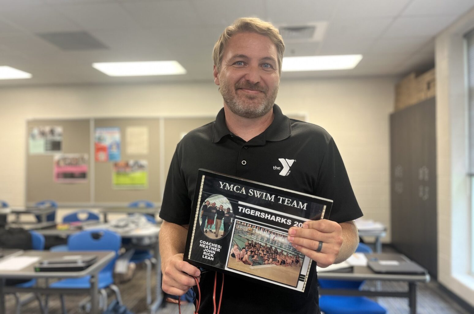 Clarke Central High School head varsity swim and dive coach Rick Simonds poses in Room 407 at Burney-Harris-Lyons Middle School on Aug. 12. Simonds,a CCHS Class of 2003 alumnus, has returned to the Clarke County School District for the 2025-26 school year to teach eighth-grade Georgia Studies at BHL and coach at CCHS. “I miss being around the water. I miss being around the pool, the kids, teaching them (and) coaching,” Simonds said. “I was very fortunate that when I got the job at BHL, (I) happened to see that there was a position and sort of right time, right place. (I) couldn’t be happier that I’m back (in the) Clarke County and helping out with my old high school.” Photo by Liya Taylor