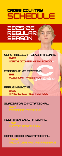 A graphic displays the Clarke Central High School varsity cross country team’s 2025-26 season schedule. At the Gladiators’ first meet of the season, the North Oconee High School Twilight Invitational on Aug. 29, the boys placed 12th and the girls placed 11th after the meet was moved from Aug. 28 to the 29. “(The meet) went really well. Most of our varsity team wasn’t there (because) it was Labor Day weekend, but I think our boys did great,” CCHS head varsity cross country coach Erica Cascio said. Graphic by Cooper Jones, photo by Iliana Tejada