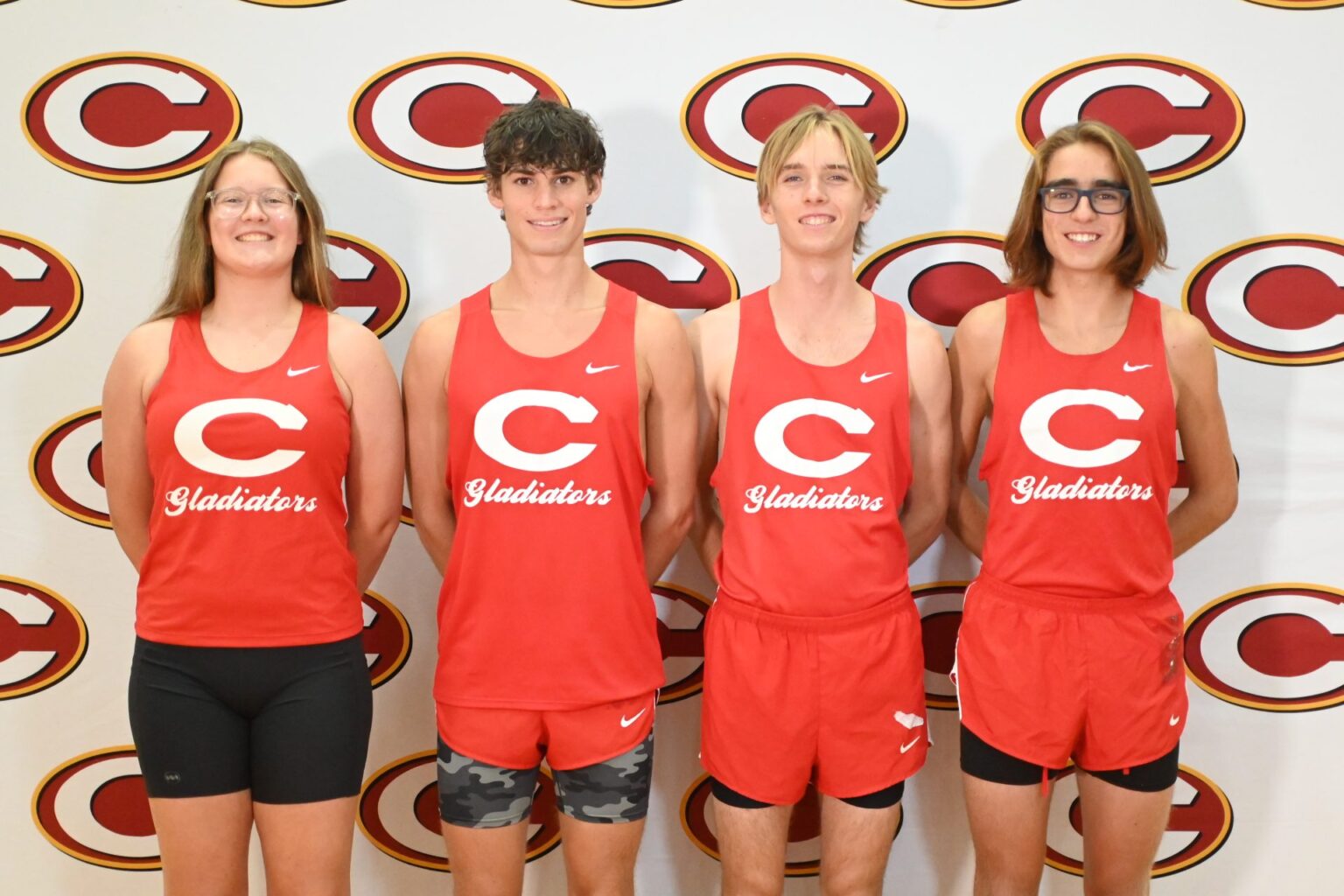 Clarke Central High School varsity cross country team co-captains Ailynn Irwin, JD Daniel, Waylon Vaughn and Noah Kilpatrick (from left to right), all seniors, pose during the ODYSSEY Media Group’s Fall Media Day on Aug. 23 in the CCHS Competition Gym. As they enter their senior season, all four captains have experienced running-related injuries during their high school careers. “This off-season, I was coming off a stress fracture on my ankle, so I wasn’t able to run at the end of last track season and early off-season, but I picked up my cross-training and came back into training with the team recently,” Daniel said. Photo by Iliana Tejada