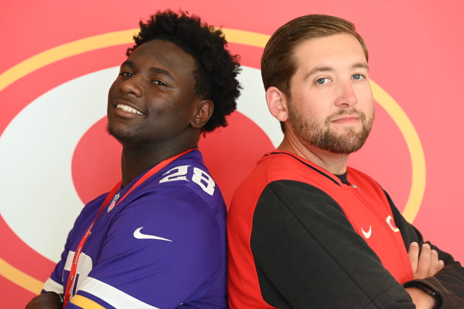 Host Dream Freeman, an ODYSSEY Media Group Sports Staffer and Clarke Central High School boys varsity football defensive end, poses with CCHS varsity defensive back football coach Zach Howard on Sept. 15 in Mell Lobby at CCHS. Howard recapped the CCHS varsity football team’s loss on Sept. 5 against North Oconee High School with a score of 40-0 and previewed the Gladiators’ upcoming game against Jackson County High school on Sept. 19. “We gave up two home runs (during the team’s game against NOHS) which cannot happen from a defensive back standpoint,” Howard said. Photo by Maypop Wren