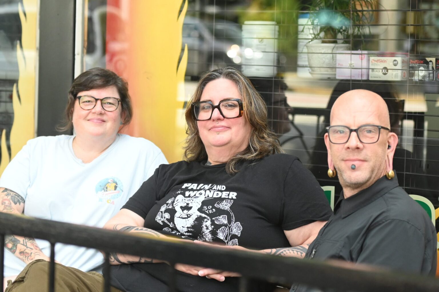 Pain and Wonder Tattoo and Piercing Studio General Manager Carolyn Rittweger, Owner Bethra Szumski and Piercer Randy Smyre, sit outside the shop on, Sept. 19. To keep up to date with societal trends, Szumski has worked to keep the shop environment fresh and promote what makes the studio unique. “We try to stay fresh with what we’re doing. We fully renovated last year, really breathed into who we are as a company,” Szumski said. “People aren’t going to celebrate you as a business if you don’t celebrate you as a business.” Photo by Iliana Tejada