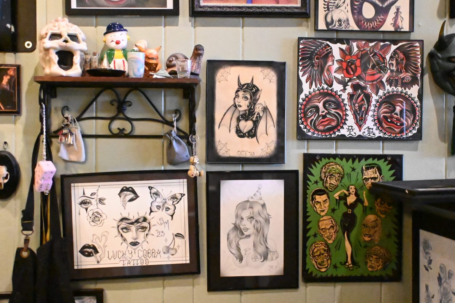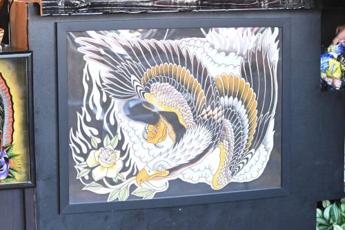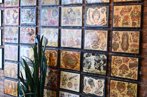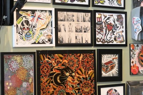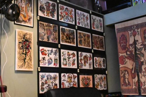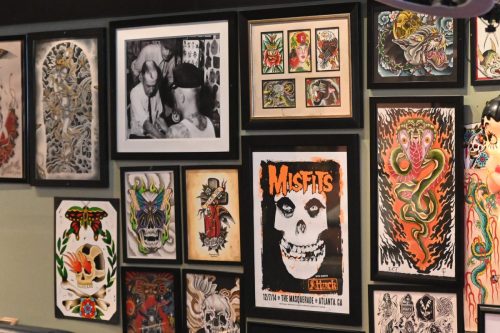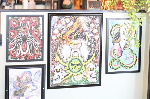 Art is displayed on the walls of Lucky Cobra Tattoo on Sept. 22. Owner of the shop, Charley Ferlito has worked throughout his career to find a balance between fulfilling client requests and expressing his creativity. “Some people are tattooists, which means that they’re tattoo artists. Some people are tattooers, which means that they’re tattoo doers,” Ferlito said. “I’m a tattoo doer, I’m very artistic, but I think it’s important to be able to help people with their vision as much as it is (the artist’s vision.)” Photo by Iliana Tejada