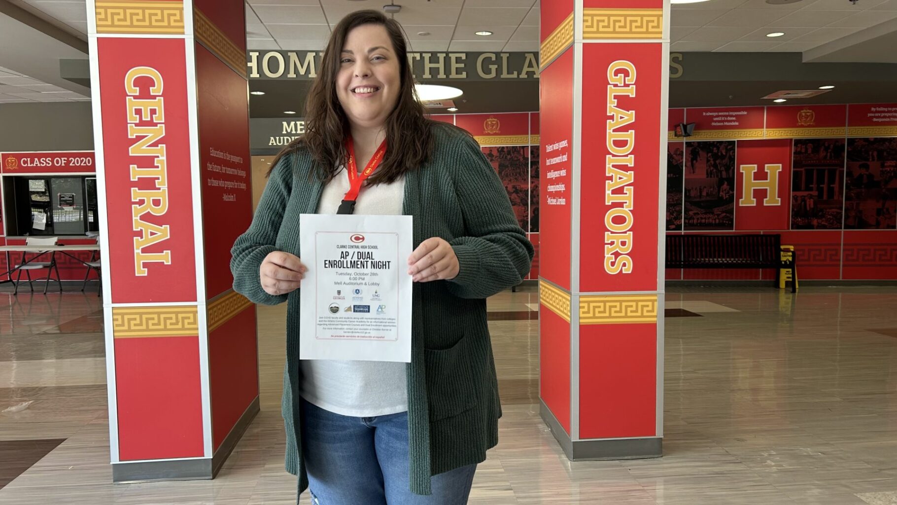 Clarke Central High School Dual Enrollment Coordinator Catherine Melton poses with the flyer for AP/Dual Enrollment Night in E.B. Mell Lobby on Oct. 24. Melton prepared a presentation about dual enrollment for the event, which will take place on Oct. 28 at 6 p.m. in the E.B. Mell Auditorium. “It’s my goal that if students do continue to take college level classes, whether it’s you take an intro level welding class at Athens Tech your senior year, and you really love it, and then you continue after graduation to finish that program and get a really great paying job, or maybe you’re taking a class at (University of North Georgia or the University of Georgia), and that’s an intro level class to what will be your future major,” Melton said. Photo by Lea D’Angelo