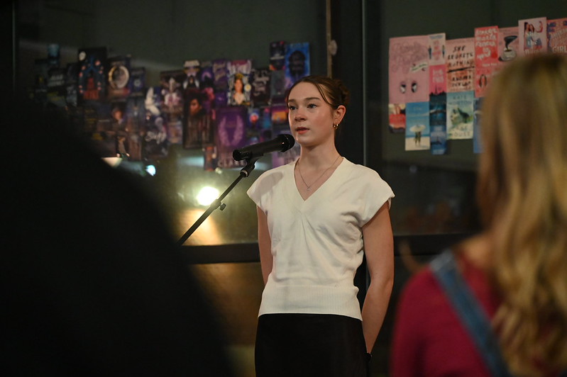 Clarke Central High School Contemporary Literature and Composition student Miriam Widener, a junior, recites her free-verse poem “Shower Thoughts” at the Poetry Showcase in the CCHS Media Center on Dec. 3. CCHS English for Speakers of Other Language department teacher Carrie Emerson attended the showcase and highlighted the variety of works delivered, including Contemporary Literature and Poetry student Andres Nava’s poems “A Land of Pain and Hope,” which discusses Venezuela’s dictatorship and “Dude Heaven,” which imagines the ideal place for adolescent men. “I got to sit with (Nava’s) parents. It was nice to just see that they were here to support him. I thought it was really special that he wrote a heart wrenching poem and then he had a super funny poem, ‘Dude Heaven,’” Emerson said. Photo by Maypop Wren