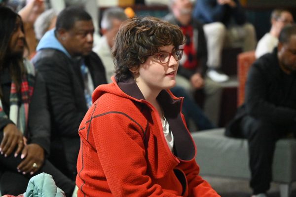 Clarke Central High School sophomore GJ Jaumot-Ramos attends the Poetry Showcase in the CCHS Media Center on Dec. 3. Jaumot-Ramos found the performers’ delivery of their work to be a poignant part of the event. “The poems were relatable and had a lot of vivid imagery. The ones that stuck with me the most were the ones that had some sort of lyrical or rhythmic performance. (For example) the poem “Dude Heaven,” (by CCHS senior Carson Richardson and CCHS senior Andres Nava, had) a call and response that was memorable.” Photo by Maypop Wren