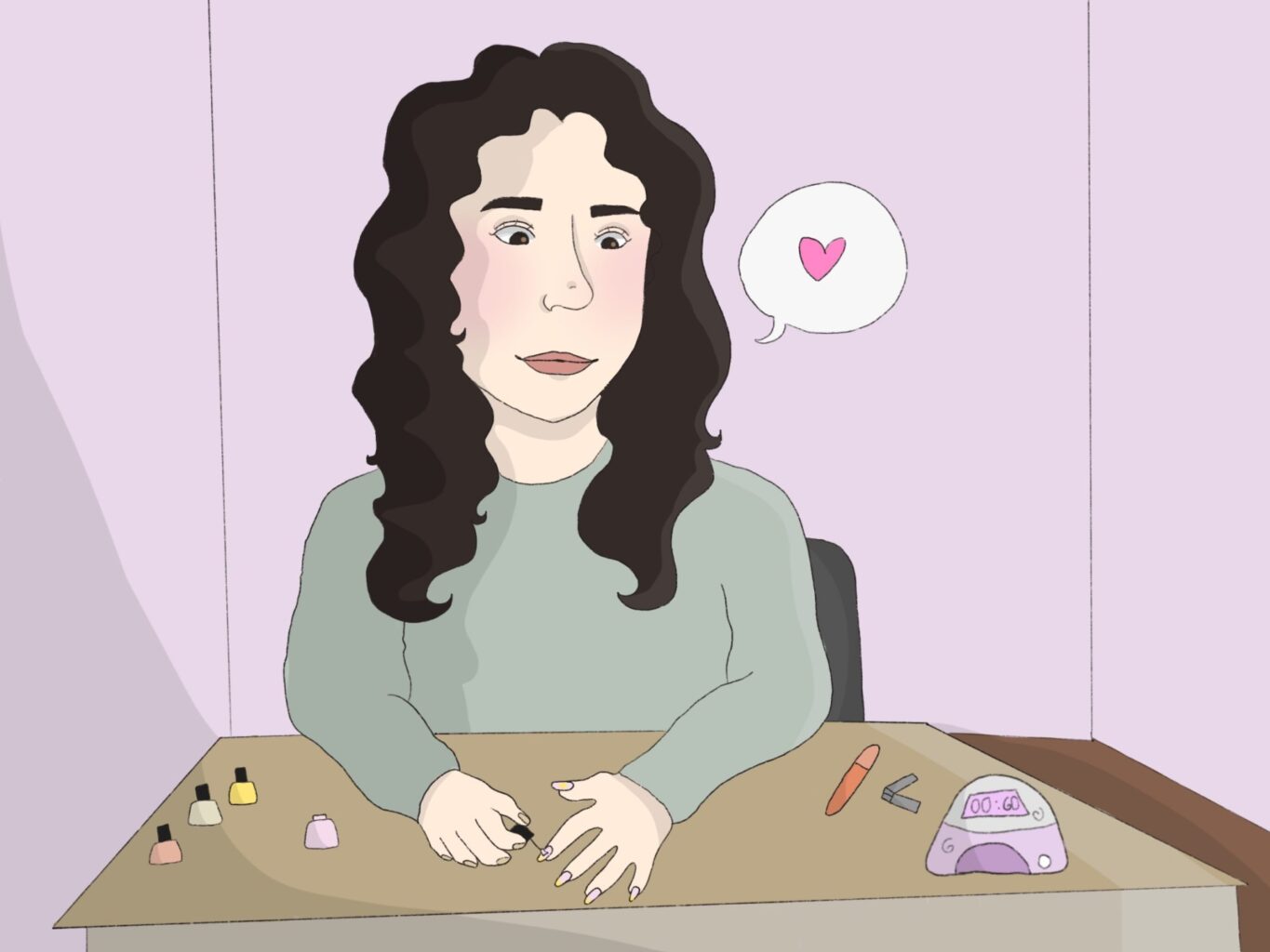 An illustration shows Viewpoints Staffer Sara Stuart painting her nails at her desk. Stuart started doing nails in 2024 due to inspiration from a friend and it has has given her a creative outlet that she didn’t have before. “A friend inspired me to start doing nails. Once I started, I wanted to keep practicing and improve their look. At first, I often got more polish on my fingers than my nails, but I never stopped practicing and trying out designs,” Stuart wrote. Illustration by Sylvia Robinson
