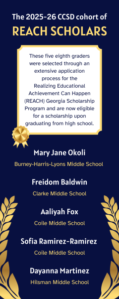 Every year, five eighth graders from each participating Georgia school system are accepted into REACH, a needs-based scholarship and mentoring program. This year, the CCSD’s admittees are eighth graders Mary Jane Okoli from Burney-Harris-Lyons Middle School, Freidom Baldwin from Clarke Middle School, Aaliyah Fox and Sofia Ramirez-Ramirez from Coile Middle School and Dayanna Martinez from Hilsman Middle School.