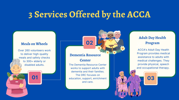 An infographic shows three services offered by the Athens Community Council on Aging. The ACCA was founded in 1967 and works to engage the older adults it serves through a variety of enrichment activities. “When we’re doing outreach events, we like to make sure we invite our participants to share their stories, because that’s the most impactful thing for people to hear,” ACCA Vice President and Director of Operations Erin Beasley said. Graphic by Sasha Barkan