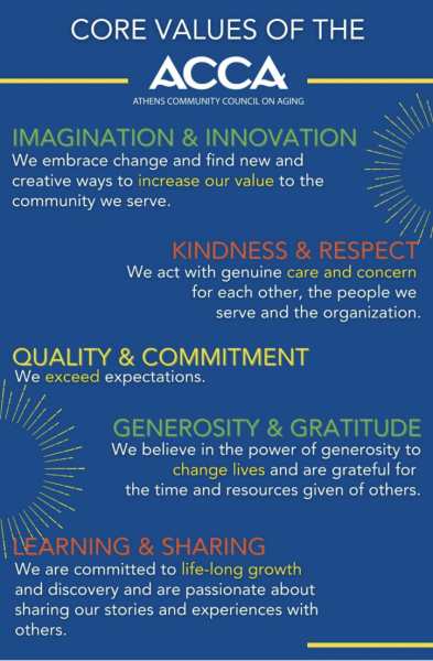 A poster shows the Athens Community Council on Aging’s core values. The ACCA has a variety of services and programs, ranging from a Dementia Resource Center to an Adventures in Dining Club. “We can serve any older adult wherever they are on the health spectrum. Obviously, we’re not a skilled nursing facility or a medical facility,“ ACCA Vice President and Director of Communications Erin Beasley