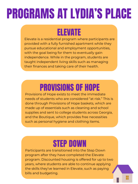 An infographic shows the three programs Lydia’s Place offers to the young adults the organization helps. Graphic by Lea D’Angelo